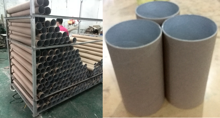 這個紙管成型的一個過程,借助于卷管機(jī)把原本分切好的紙幾張粘合而形成一個紙筒。不同規(guī)格直徑的紙筒需要用到不同寬度的紙。不同厚度的紙筒也分不同層次的紙張,下圖為卷管紙前而紙管形成后。